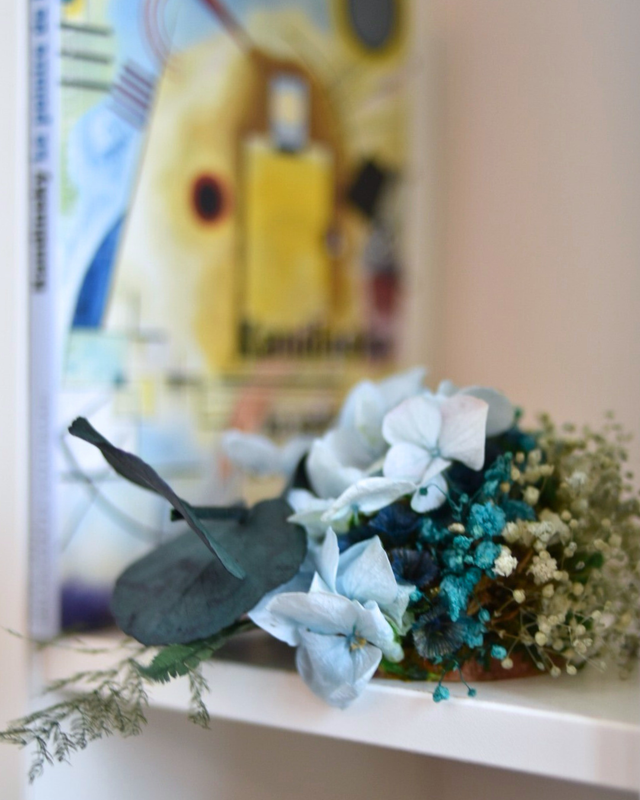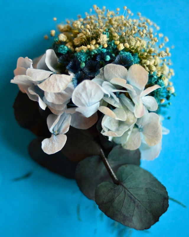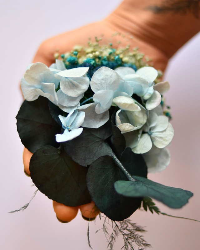Sur de larges feuilles d'eucalyptus sombres, des hortensias d'un bleu pastel et céleste dessinent le corps de la vague. "Écume Nocturne" est un fragment d'océan à contempler, parfaite pour un cadeau "Something Blue" d'exception.