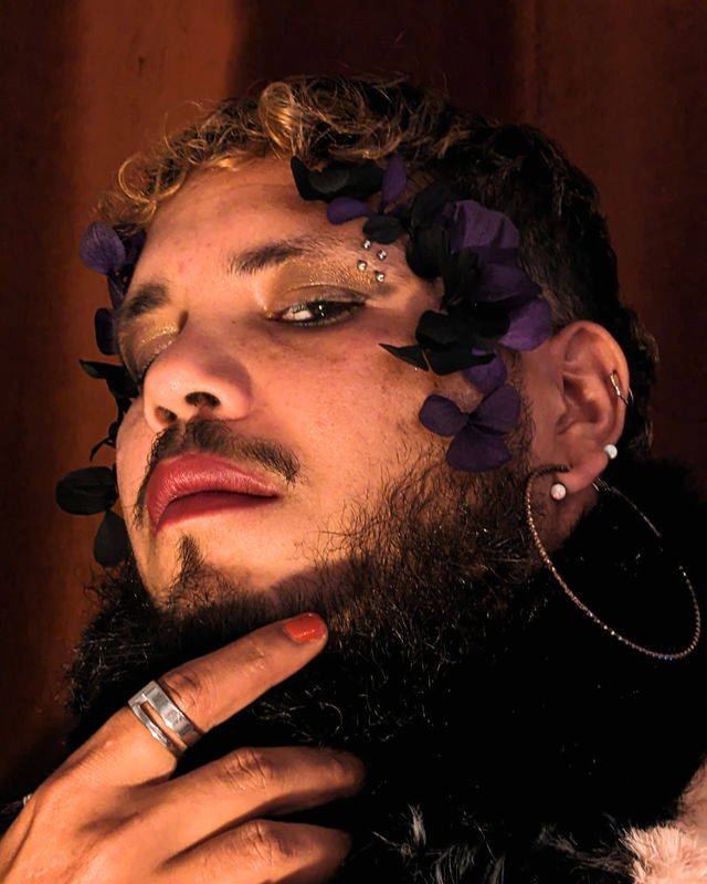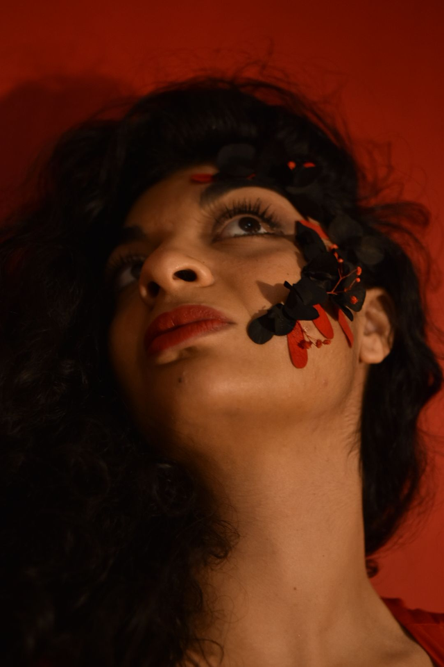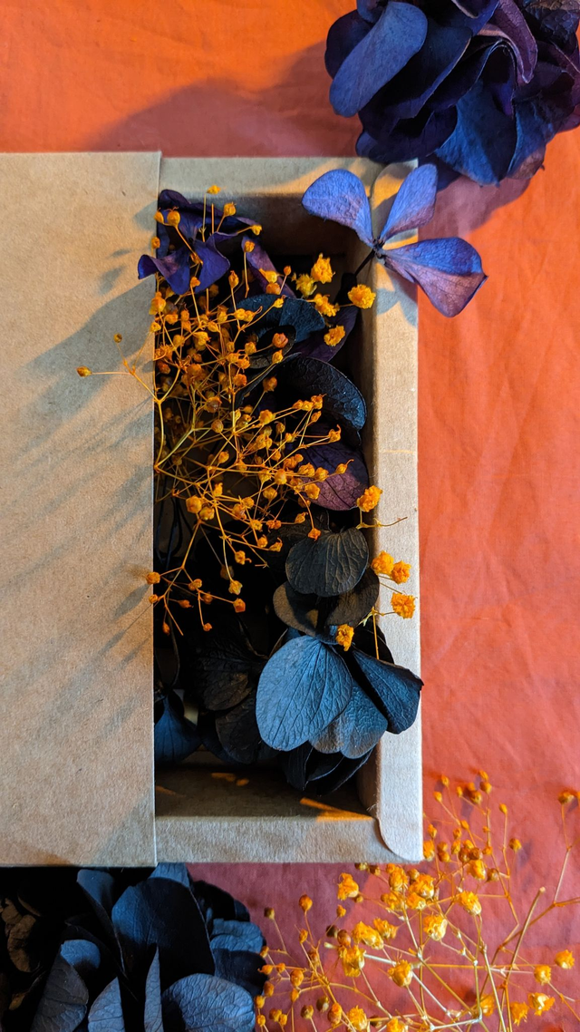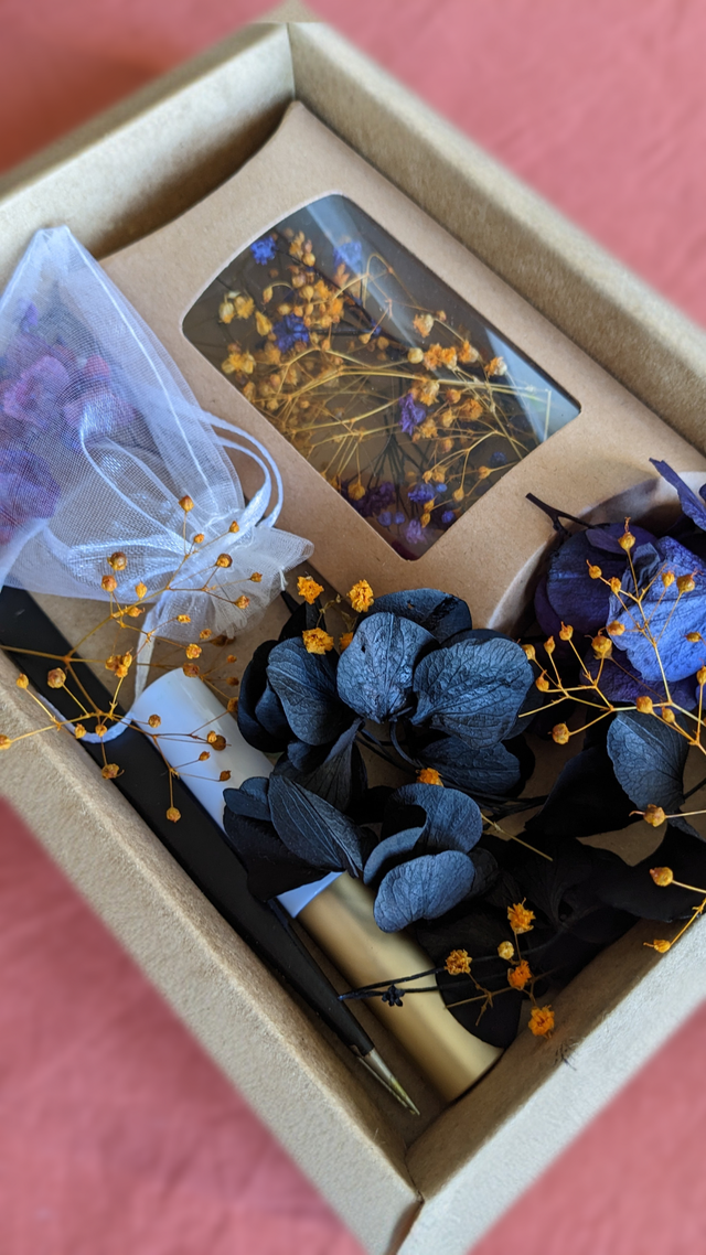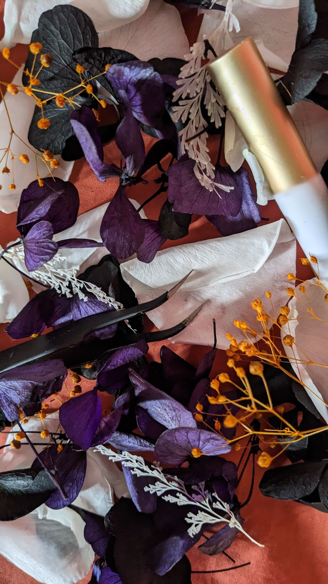 Kit de make-up floral : Hortensias noir, violet profond et gypsophiles orange, rose blanche, fougère dentelle blanche.