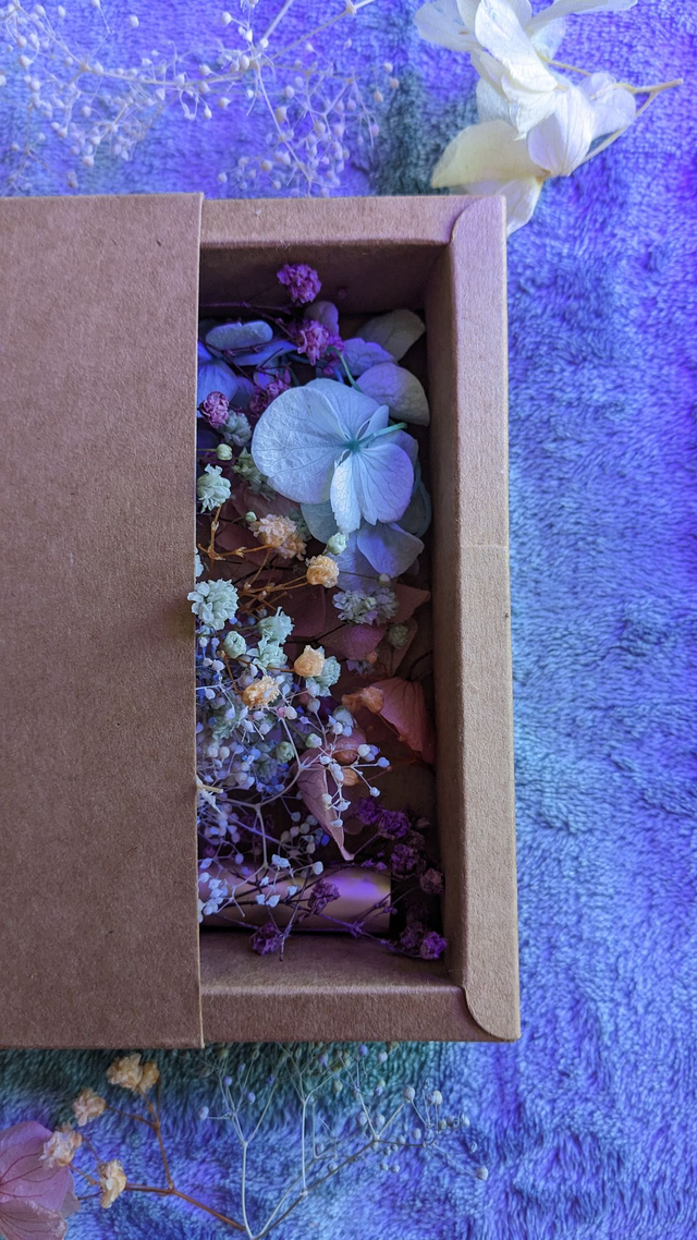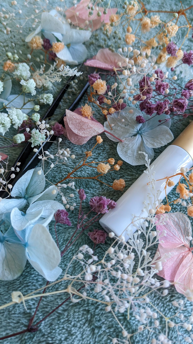 Kit de make-up floral : Hortensias bleu ciel, et rose, gypsophile pêche, lavande, rose pâle, blanc, bleu ciel et bleu métallique.